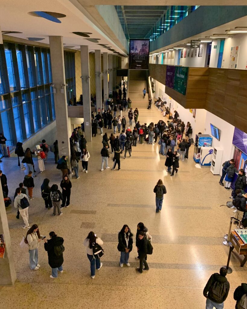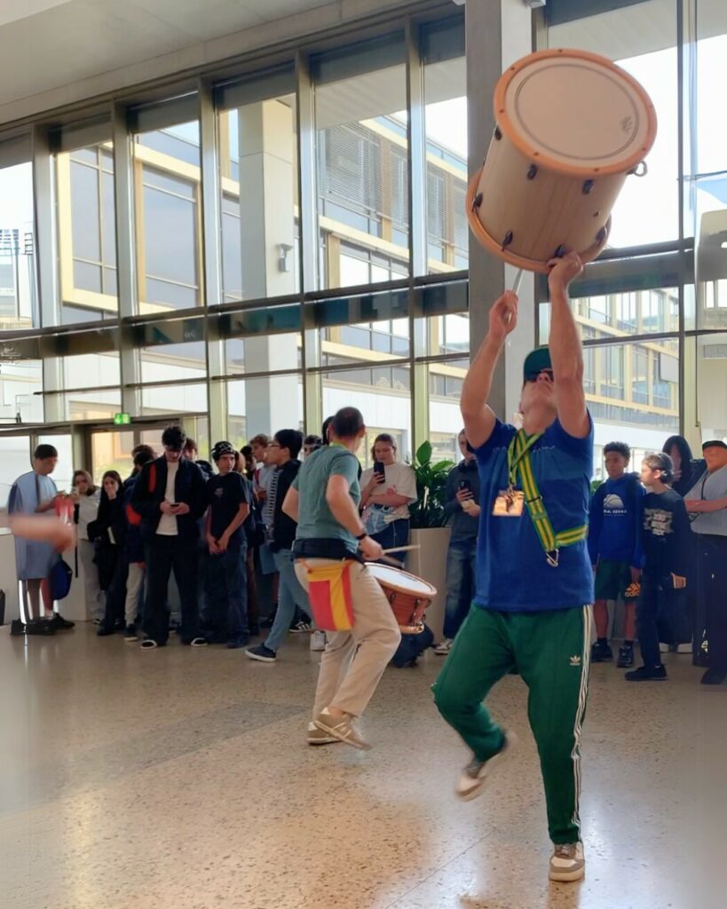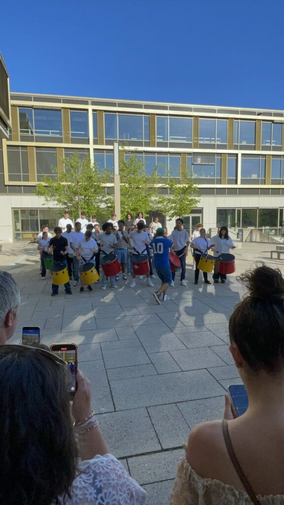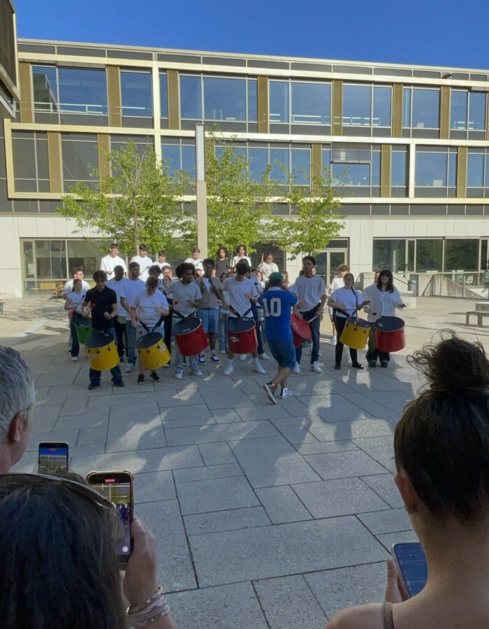 La résidence s’est aussi inscrite dans la vie du lycée au sens large. Une installation sonore immersive, diffusée dans les couloirs du bâtiment, a recréé une ambiance de stade, donnant un écho quotidien au projet en cours. Des performances spontanées – percussions dans le foyer, séquences dansées en petits groupes – ont ponctué la résidence et offert à l’ensemble de la communauté scolaire un accès direct et vivant à la création artistique.